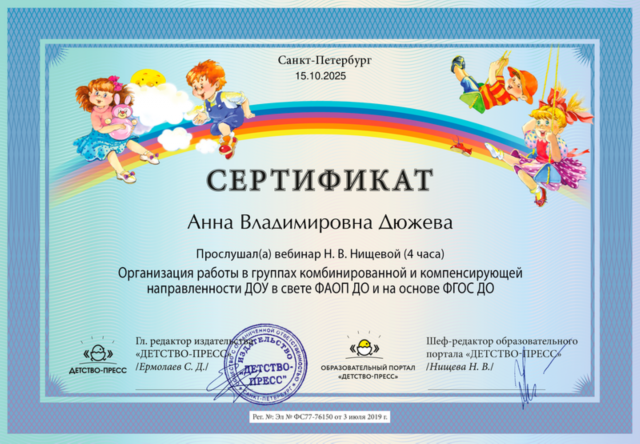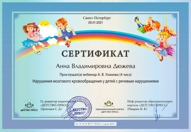 Образование: ЛГУ им. А.С. Пушкина, специальность – логопедия (2002 г.)